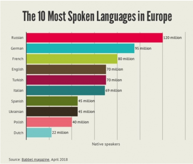 Найбільше людей у Європі говорять російською, носіїв цієї мови виявилося 120 мільйонів осіб. Друге місце зайняла німецький мова, якою розмовляють 95 мільйонів європейців. Французька, яка опинилася на третьому місці, є рідною для 80 мільйонів чоловік.